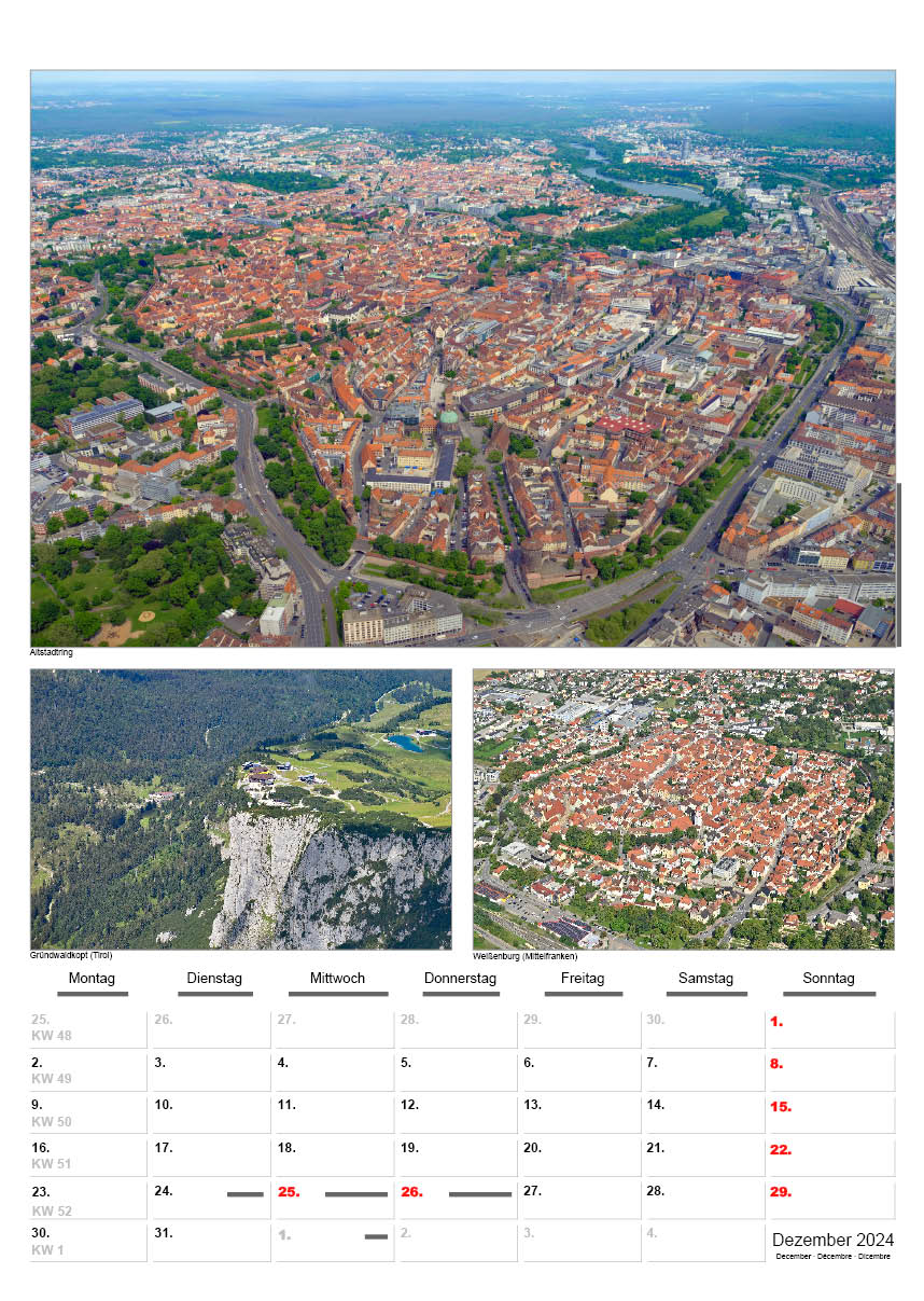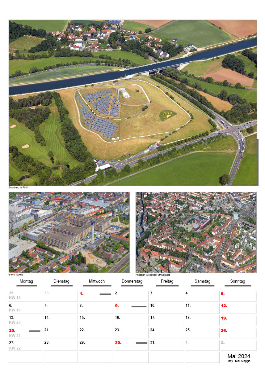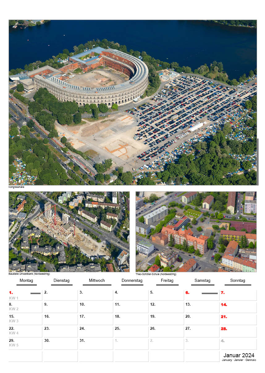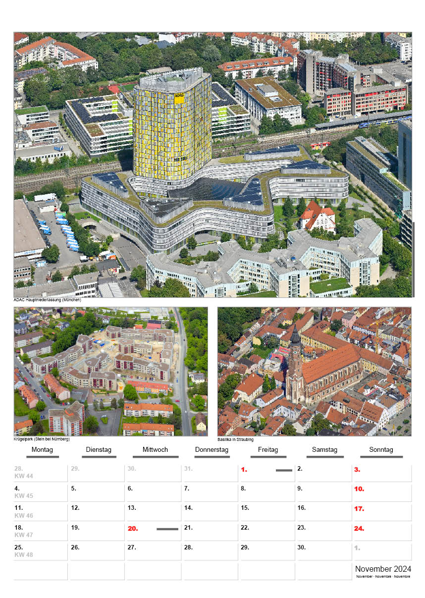 Stolz dürfen wir unseren neuen Luftbildkalender für das Jahr 2024 vorstellen. Schwerpunktmäßig waren wir diesmal über Nürnberg und Süddeutschland unterwegs, um die schönsten Momente festzuhalten. Je Monat erwarten Sie 3 Luftbildmotive, die einer nicht alltäglichen Perspektive entsprechen.