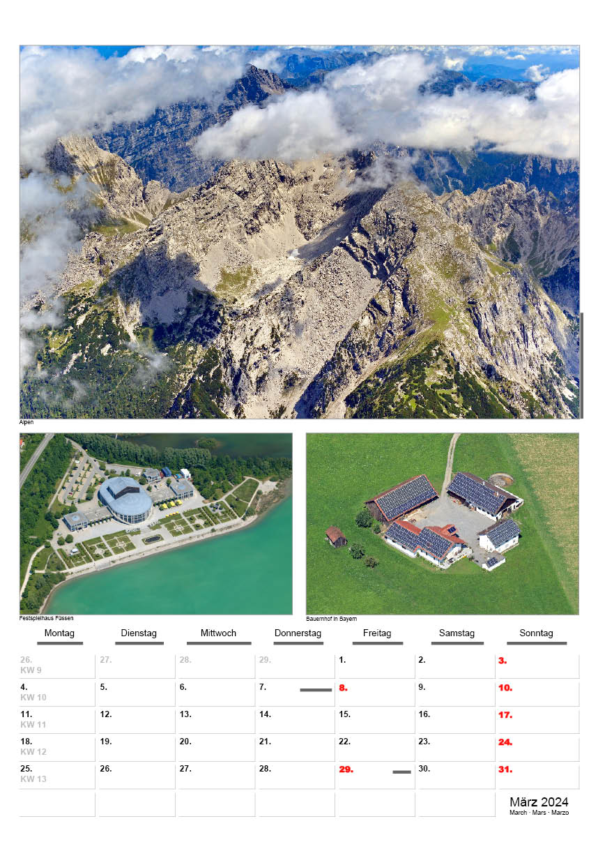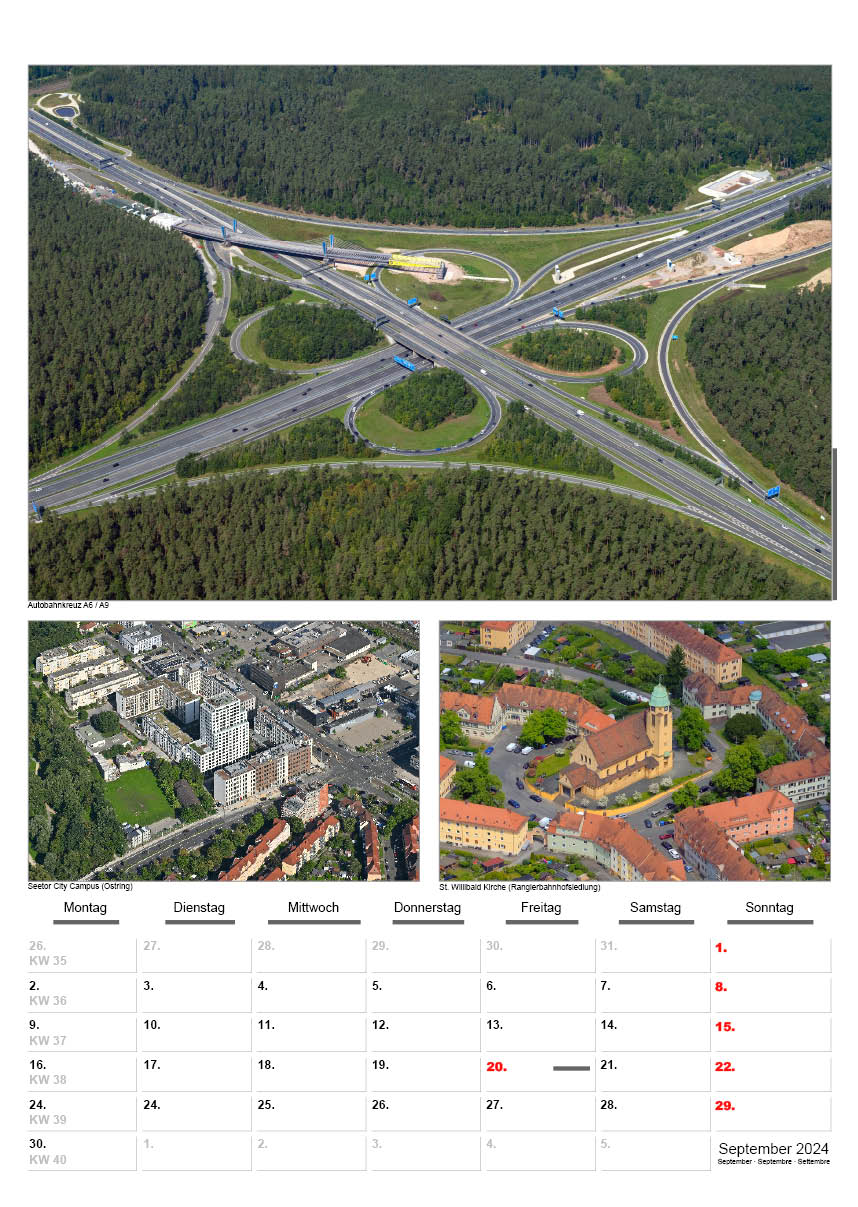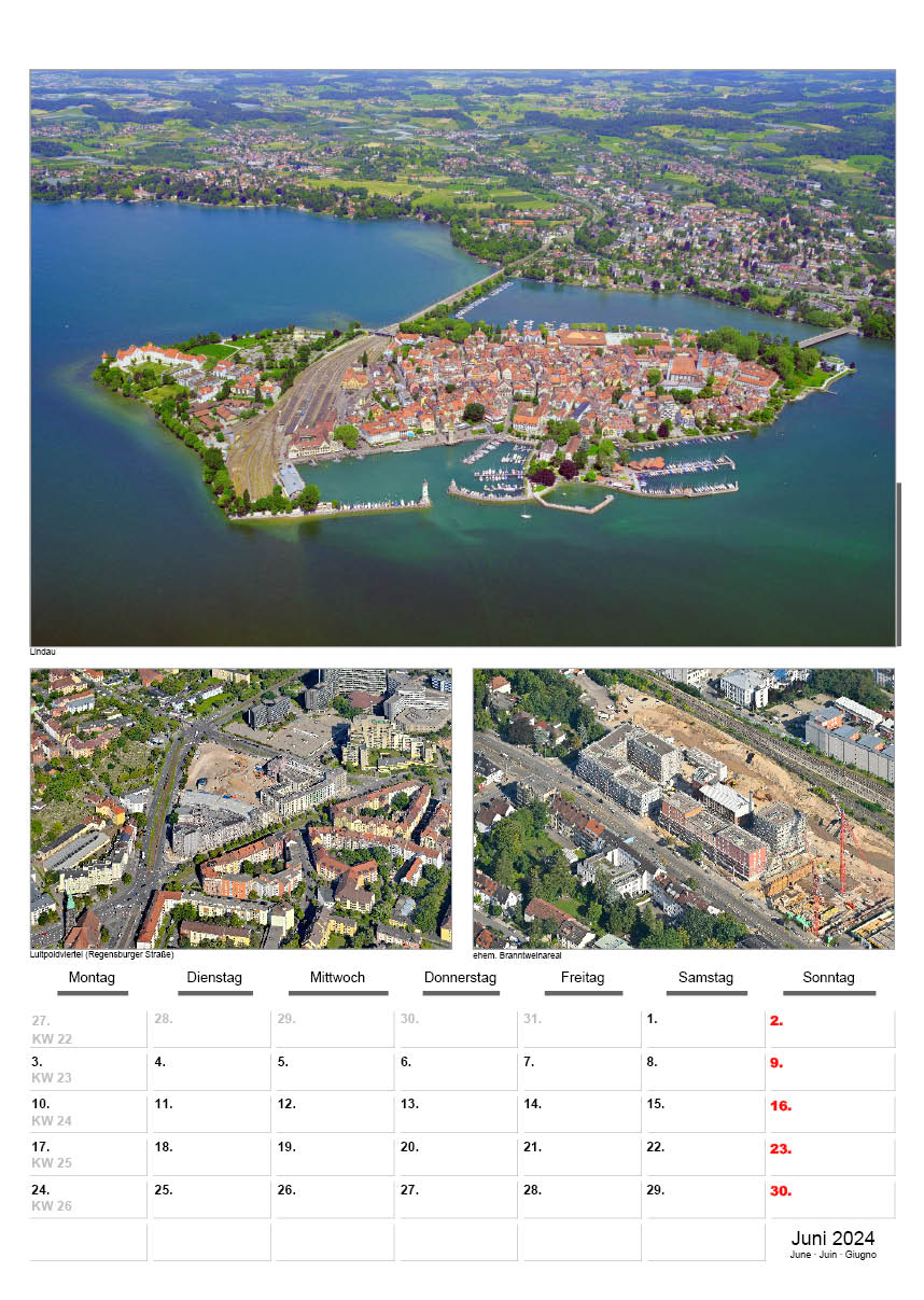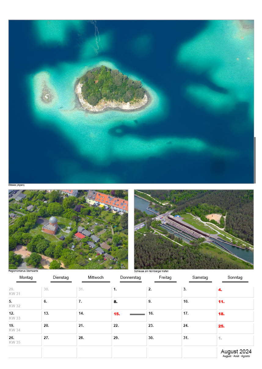 Stolz dürfen wir unseren neuen Luftbildkalender für das Jahr 2024 vorstellen. Schwerpunktmäßig waren wir diesmal über Nürnberg und Süddeutschland unterwegs, um die schönsten Momente festzuhalten. Je Monat erwarten Sie 3 Luftbildmotive, die einer nicht alltäglichen Perspektive entsprechen.