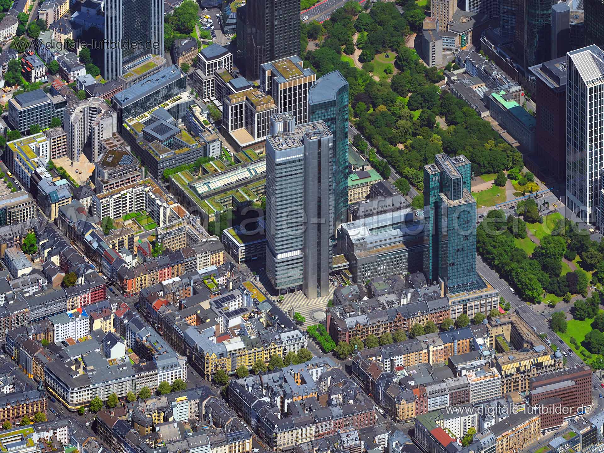 Das Luftbild zeigt folgende Straßen und Bereiche: Silver Tower, Holzmann Villa, Deutsche Bundesbank, Gallileo Hochhaus, Sykper, Skyscraper, Hochhaus, Gallusanlage, Gewerbeflächen & Gewerbeimmobilien.