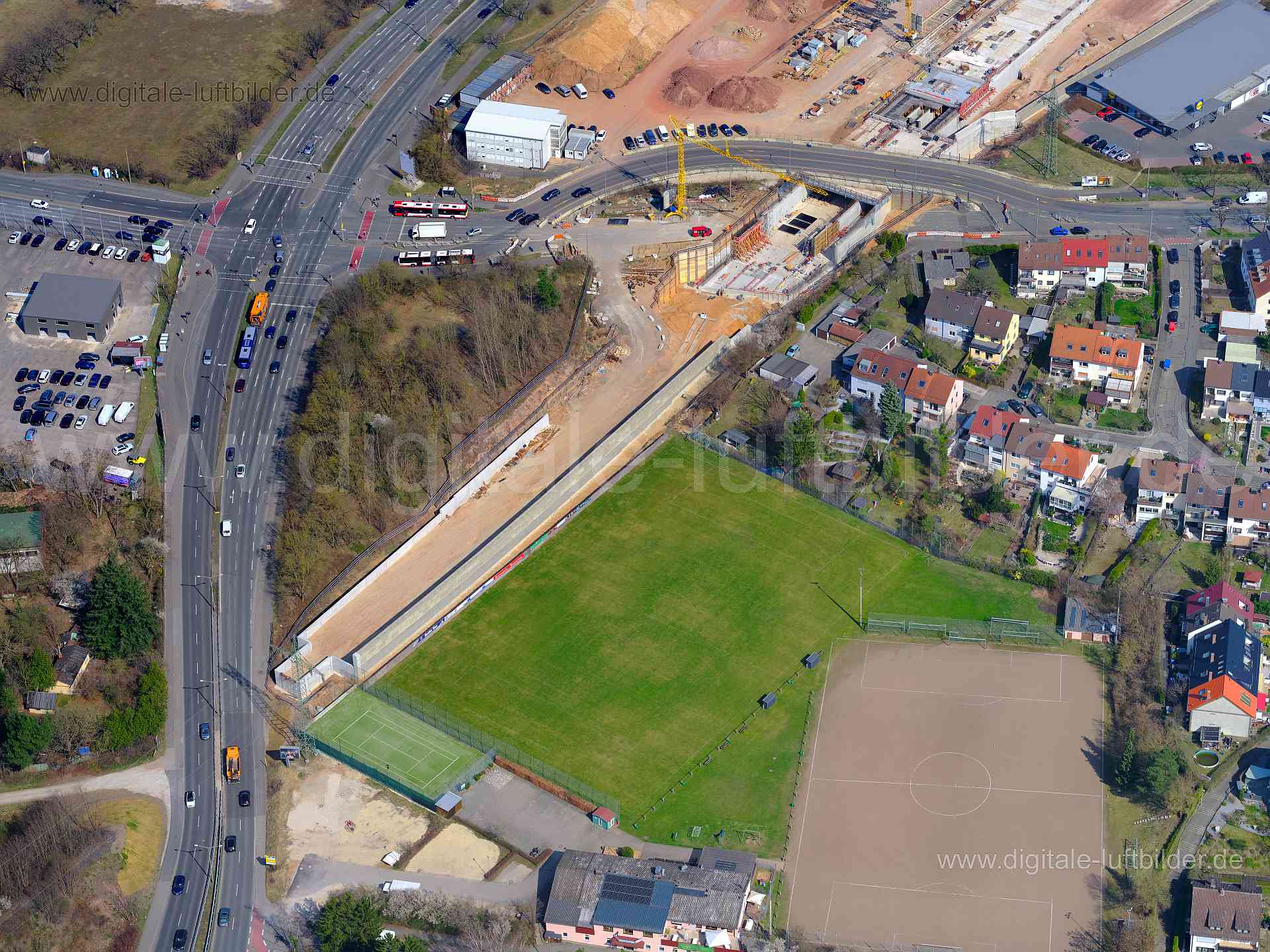 Das Luftbild zeigt folgende Besonderheiten: Bauabschnitt 2.2 U-Bahnlinie 3, Baustelle, U-Bahn, Gebersdorf, Großbaustelle, Sportplatz.